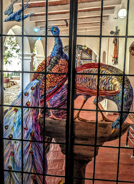 The following morning I was off to catch the Caravan to Octolan for an all day Library Tour that started off with a visit to Rodolfo Morales home. He was a first class Mexican painter. His Son showed us around the home before we left to visit a Morale's Museum , the Church and then a Morale's Mural.